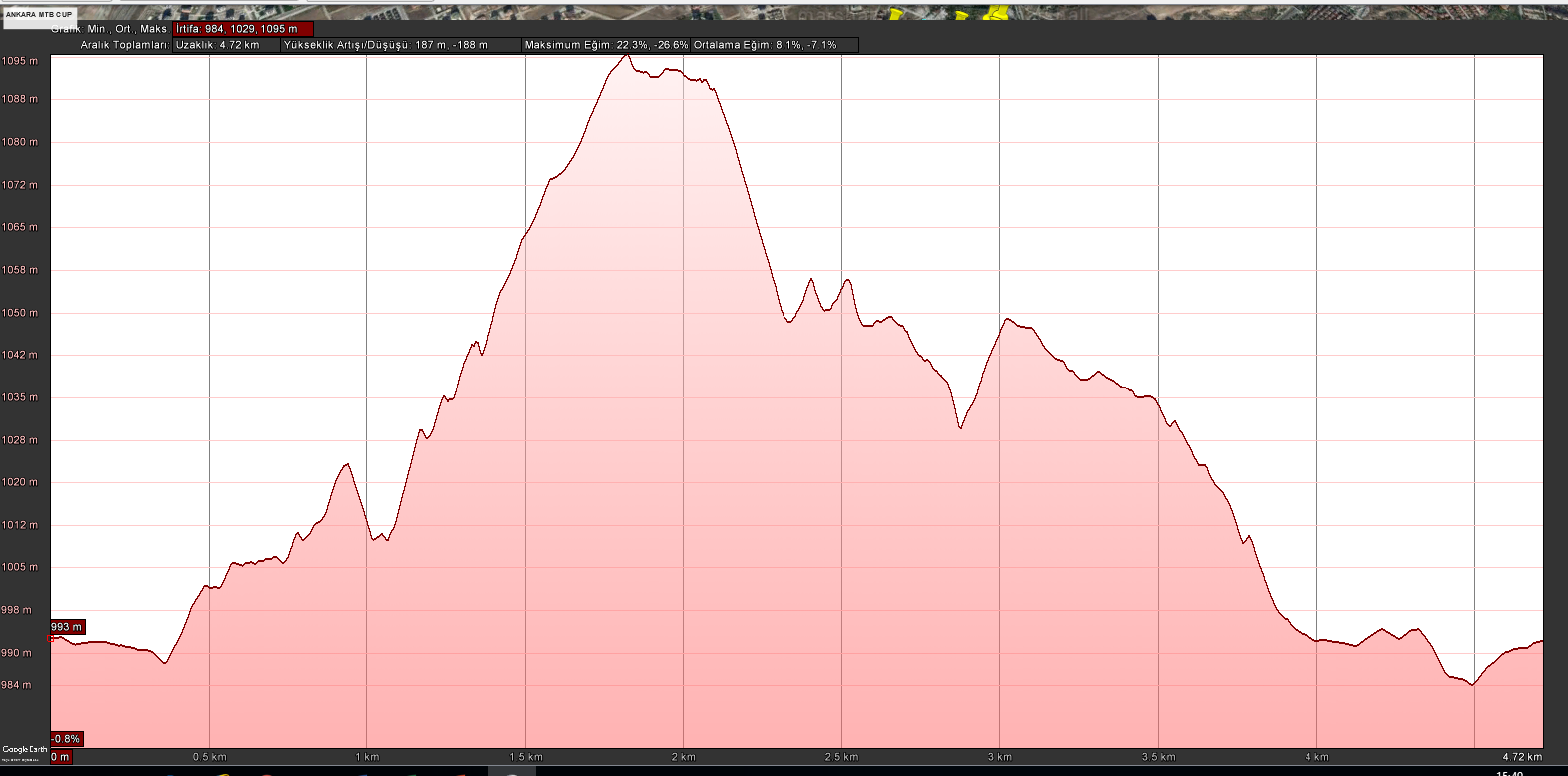 Parkur uzunluğu: 4.8 km Toplam İrtifa 183 m Min Rakım 985 Max Rakım 1095 Max eğim %22